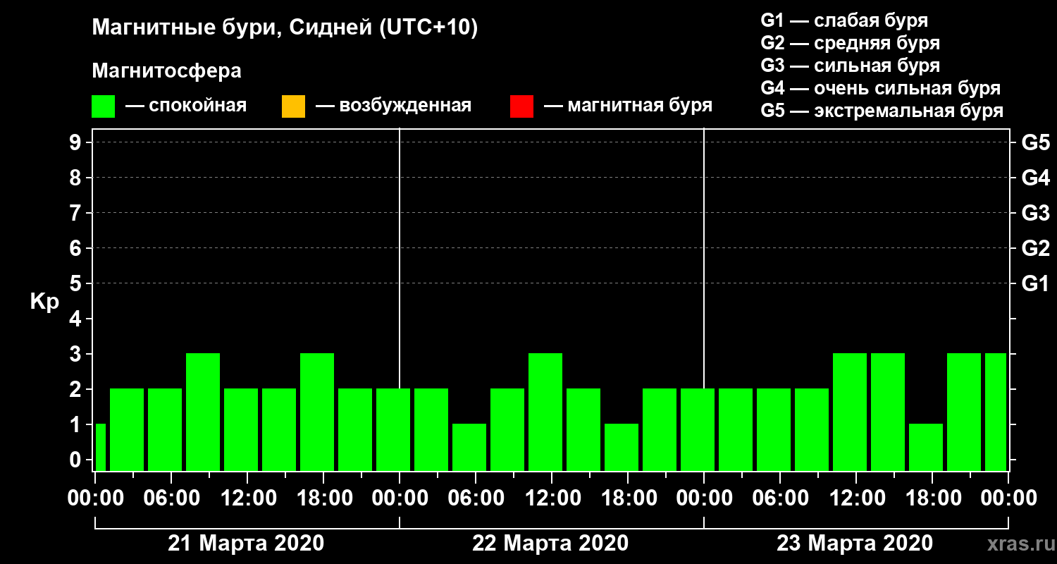 Изменения геомагнитного индекса Kp с 21 по 23 марта 2020 года для средних широт