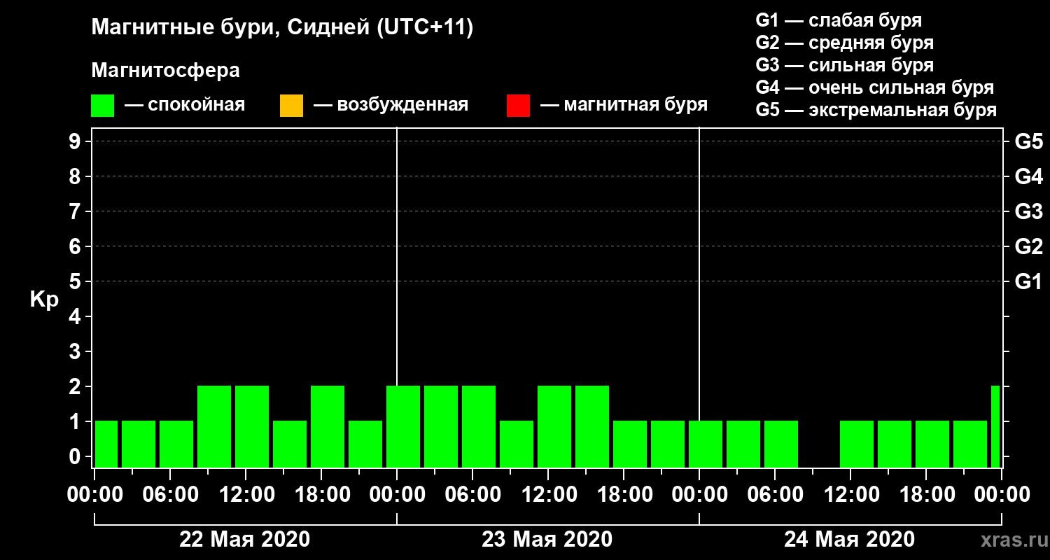 Изменения геомагнитного индекса Kp с 22 по 24 мая 2020 года для средних широт