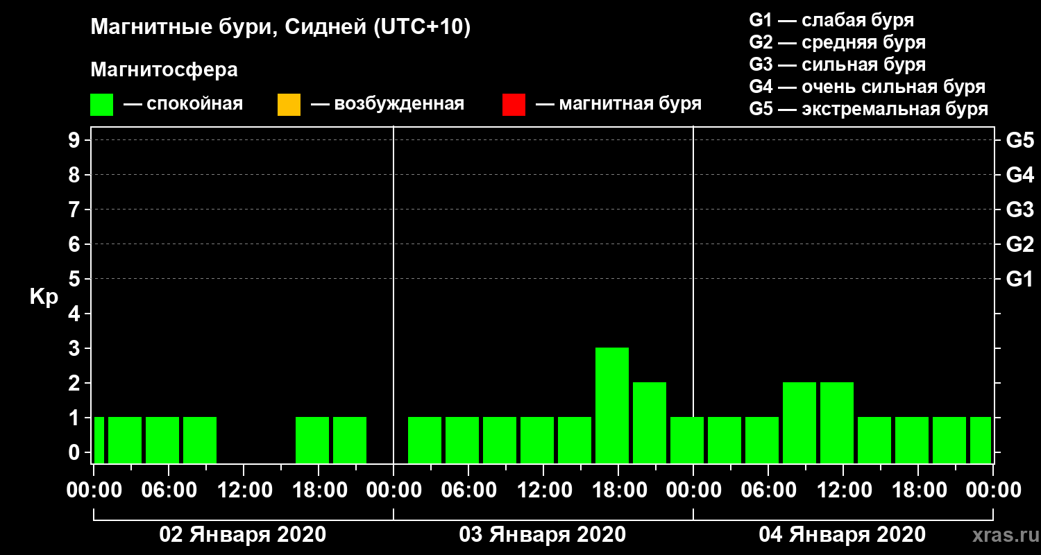 Изменения геомагнитного индекса Kp с 2 по 4 января 2020 года для средних широт