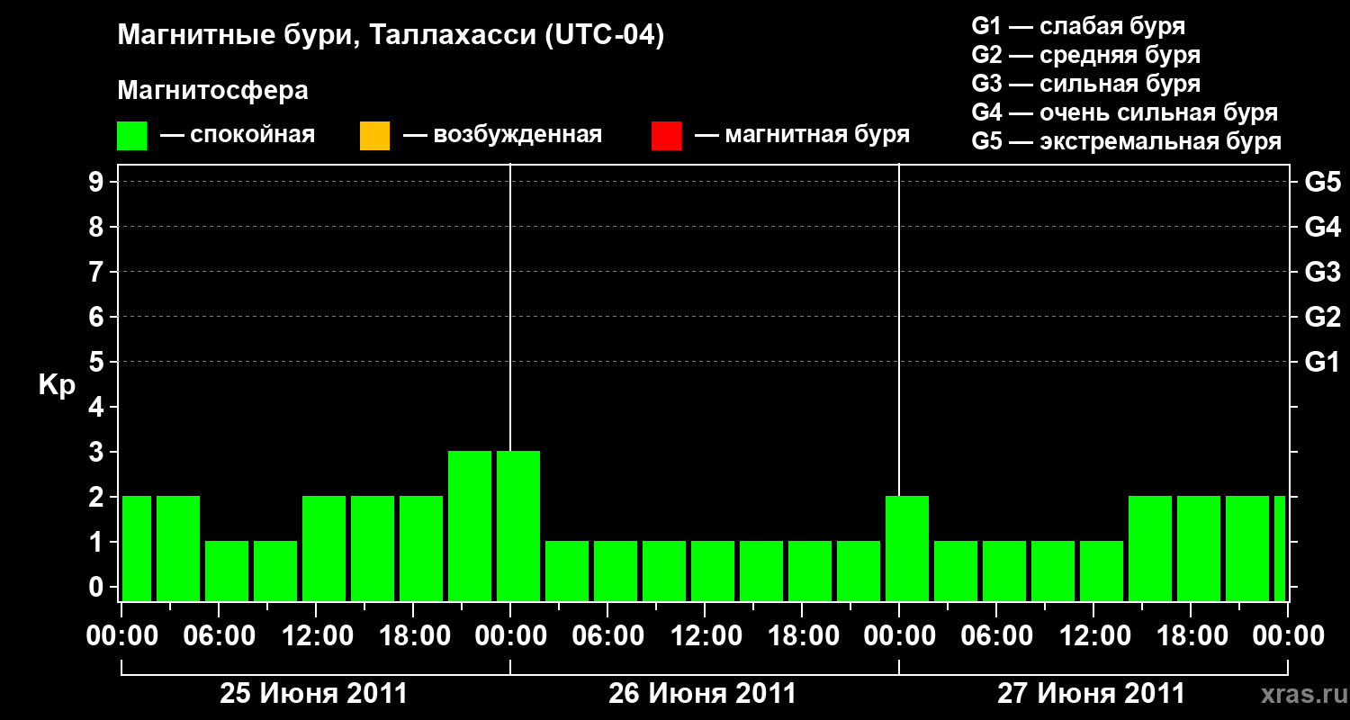 Изменения геомагнитного индекса Kp с 25 по 27 июня 2011 года для средних широт