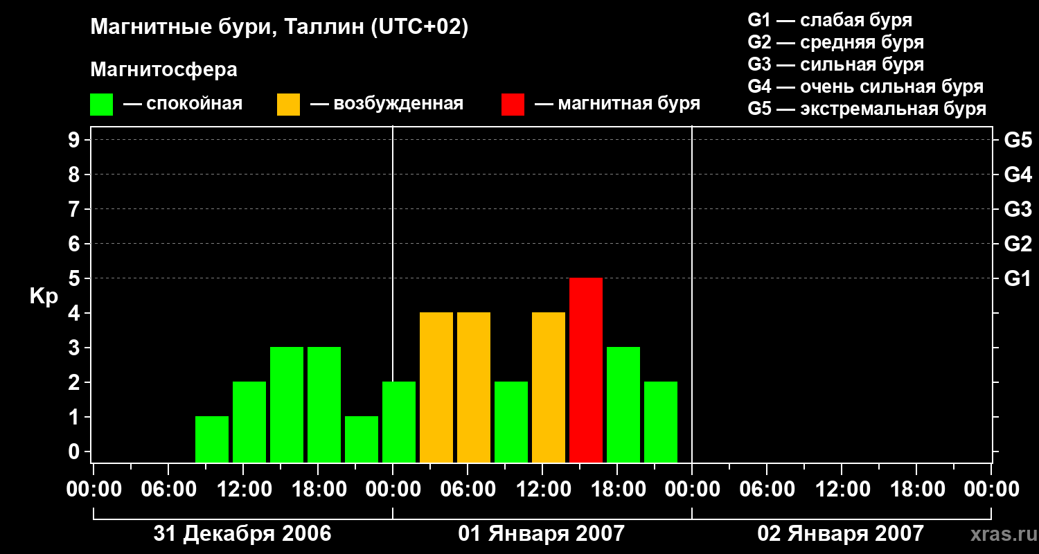 Изменения геомагнитного индекса Kp с 31 декабря 2006 года по 2 января 2007 года для средних широт