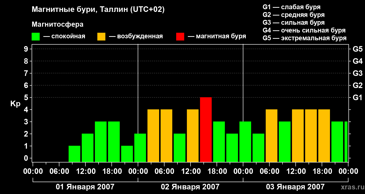 Изменения геомагнитного индекса Kp с 1 по 3 января 2007 года для средних широт