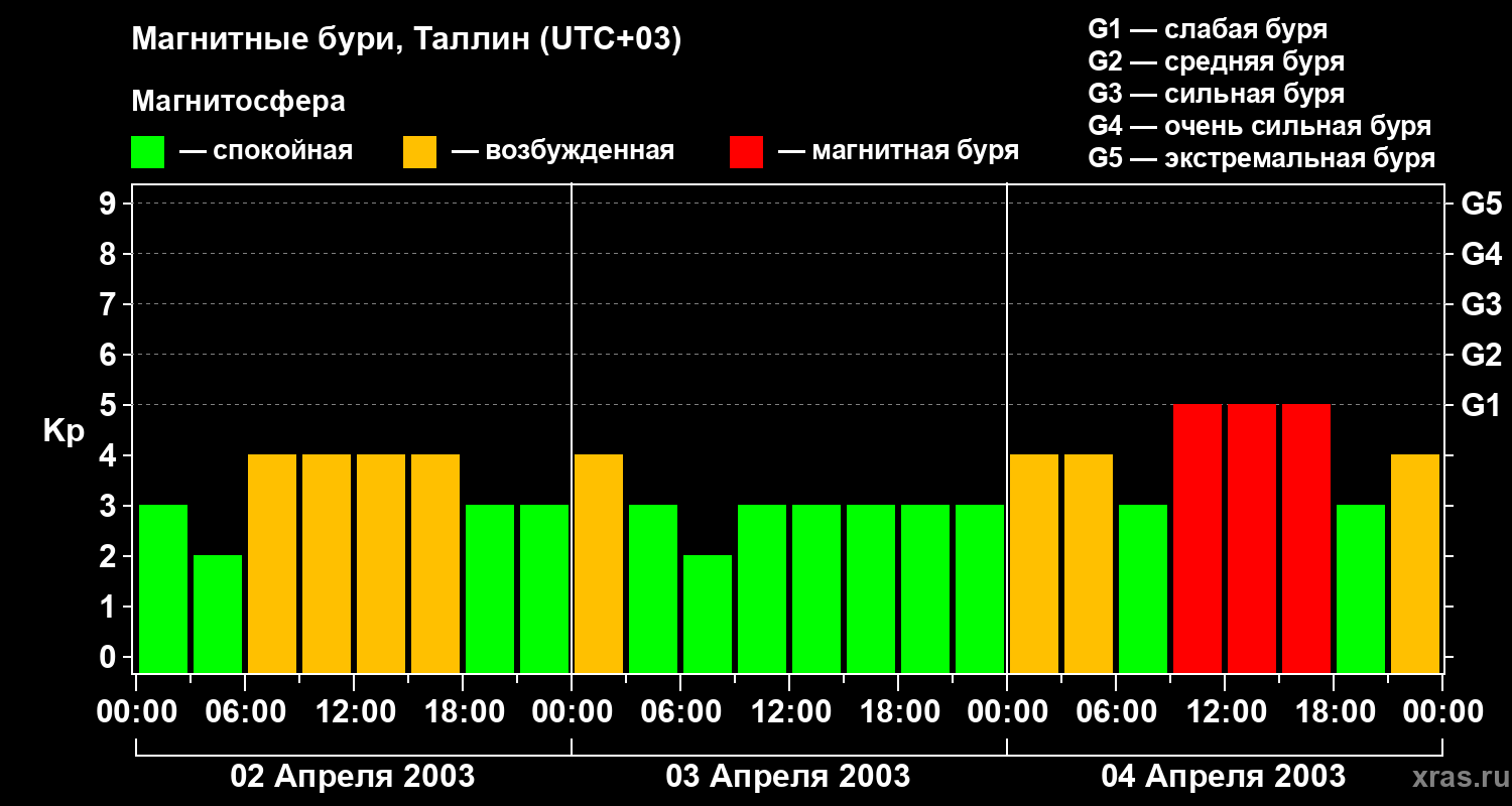 Изменения геомагнитного индекса Kp с 2 по 4 апреля 2003 года для средних широт