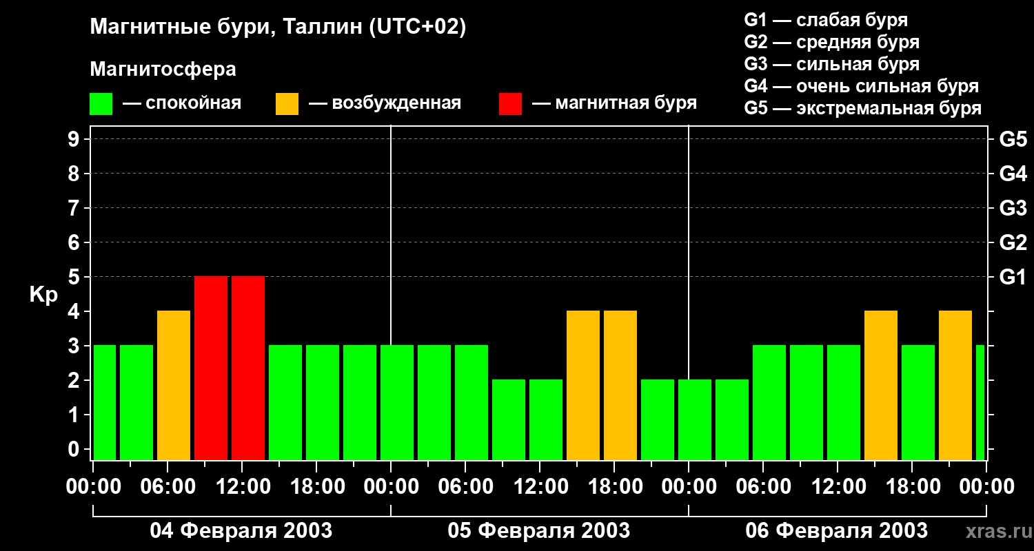 Изменения геомагнитного индекса Kp с 4 по 6 февраля 2003 года для средних широт
