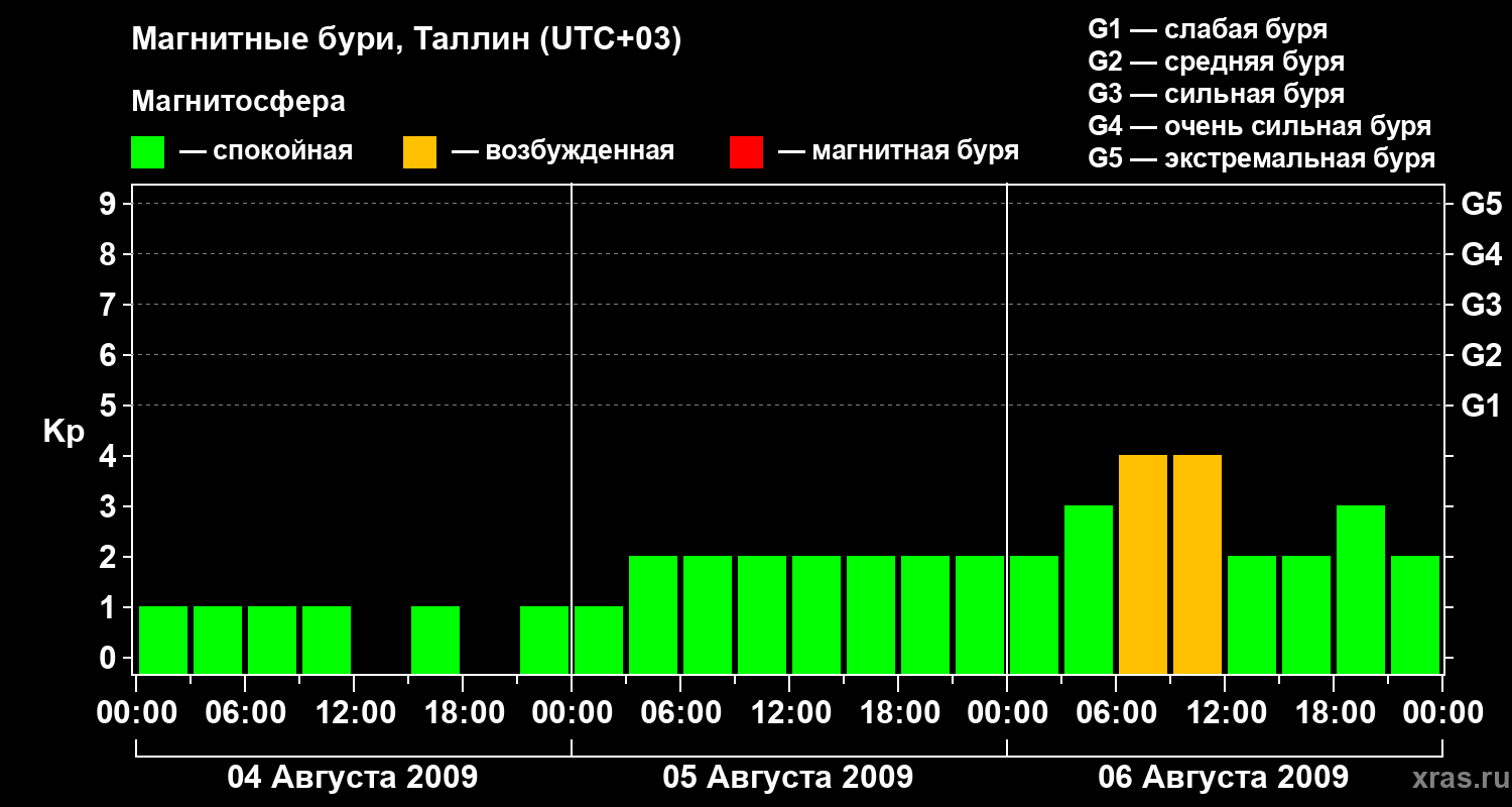 Изменения геомагнитного индекса Kp с 4 по 6 августа 2009 года для средних широт
