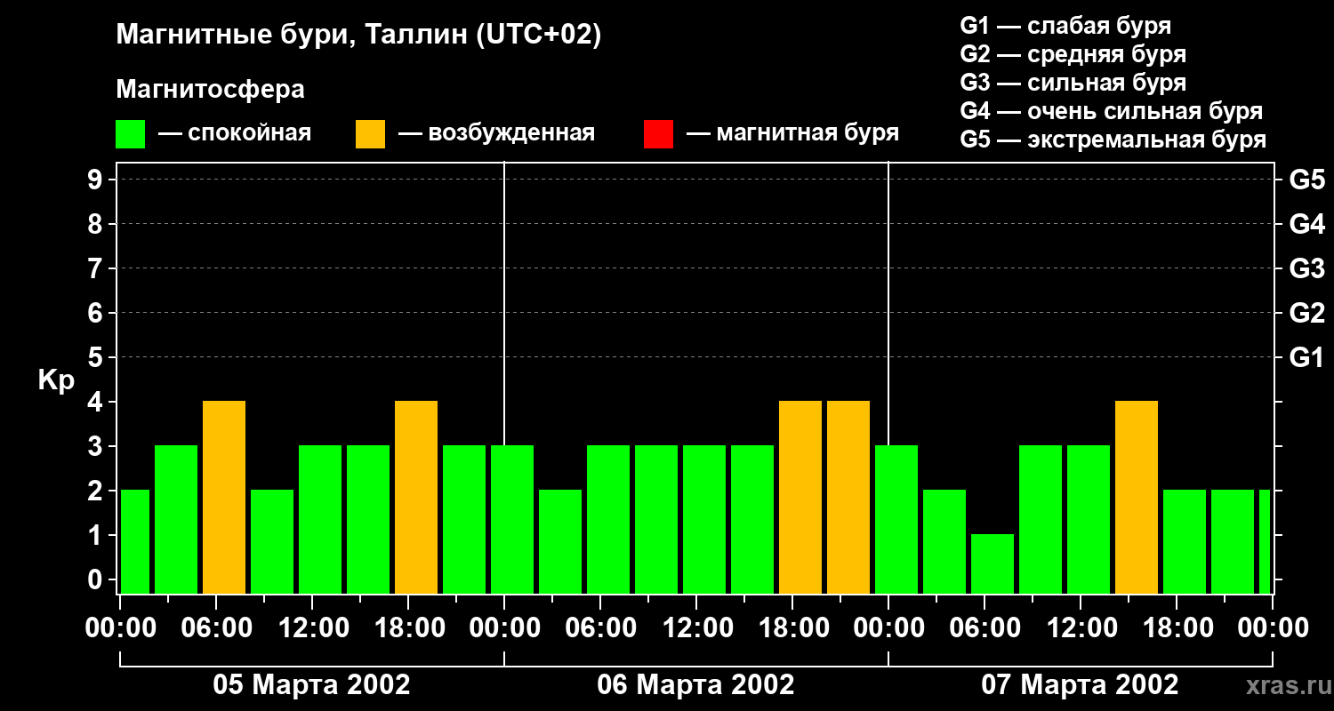 Изменения геомагнитного индекса Kp с 5 по 7 марта 2002 года для средних широт