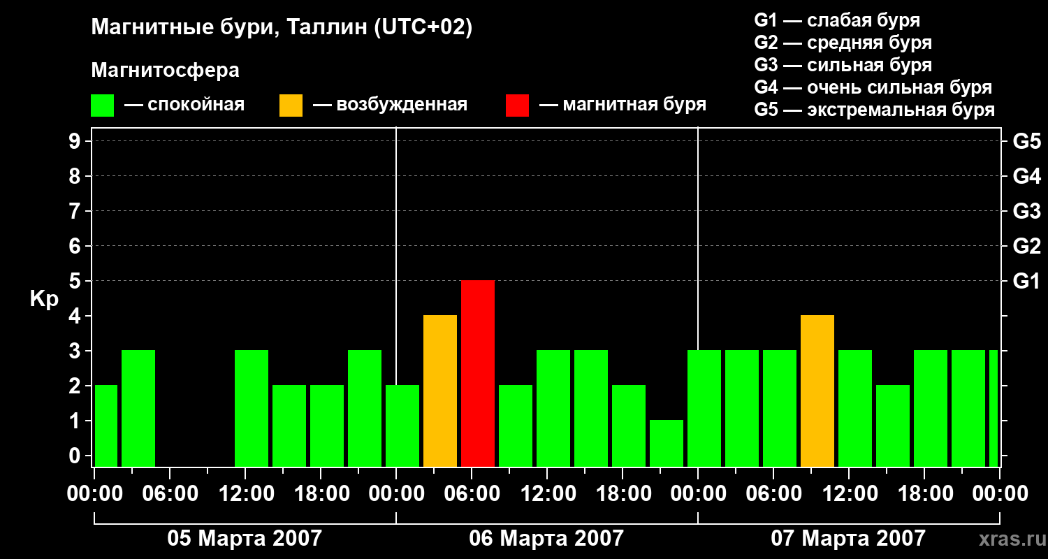 Изменения геомагнитного индекса Kp с 5 по 7 марта 2007 года для средних широт