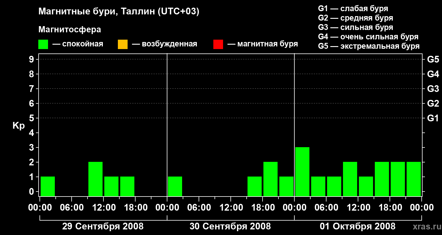 Изменения геомагнитного индекса Kp с 29 сентября по 1 октября 2008 года для средних широт