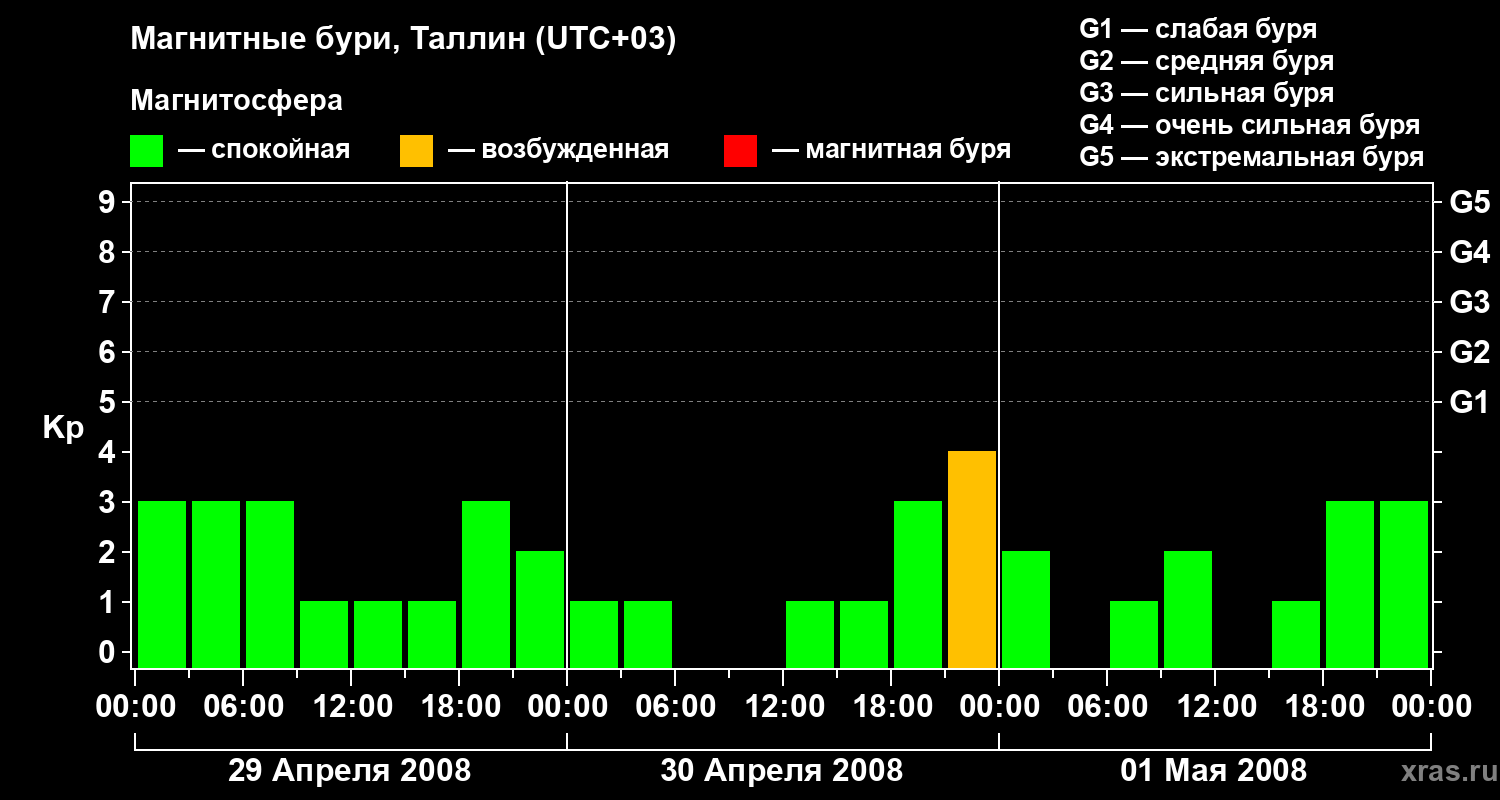 Изменения геомагнитного индекса Kp с 29 апреля по 1 мая 2008 года для средних широт