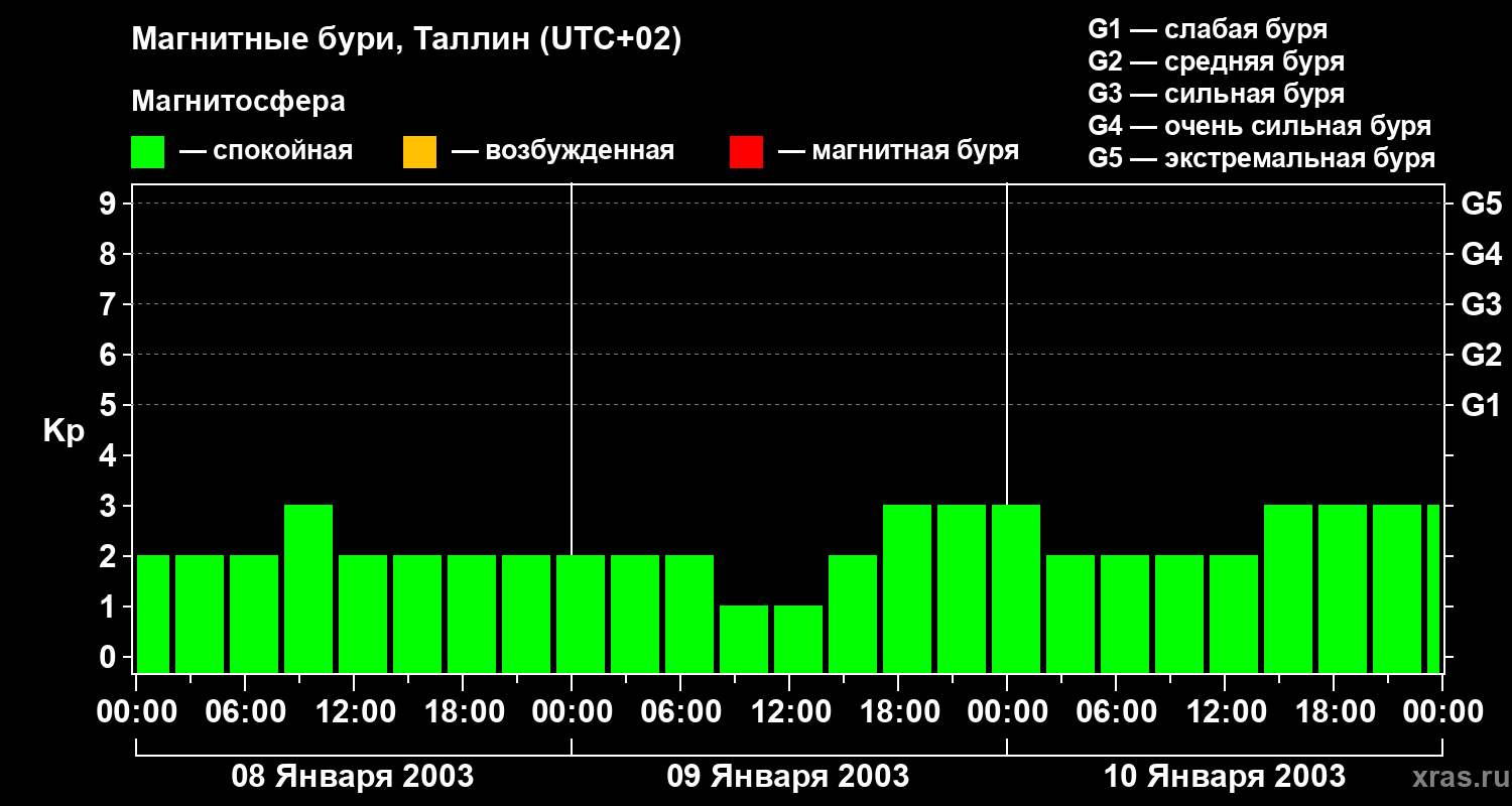 Изменения геомагнитного индекса Kp с 8 по 10 января 2003 года для средних широт