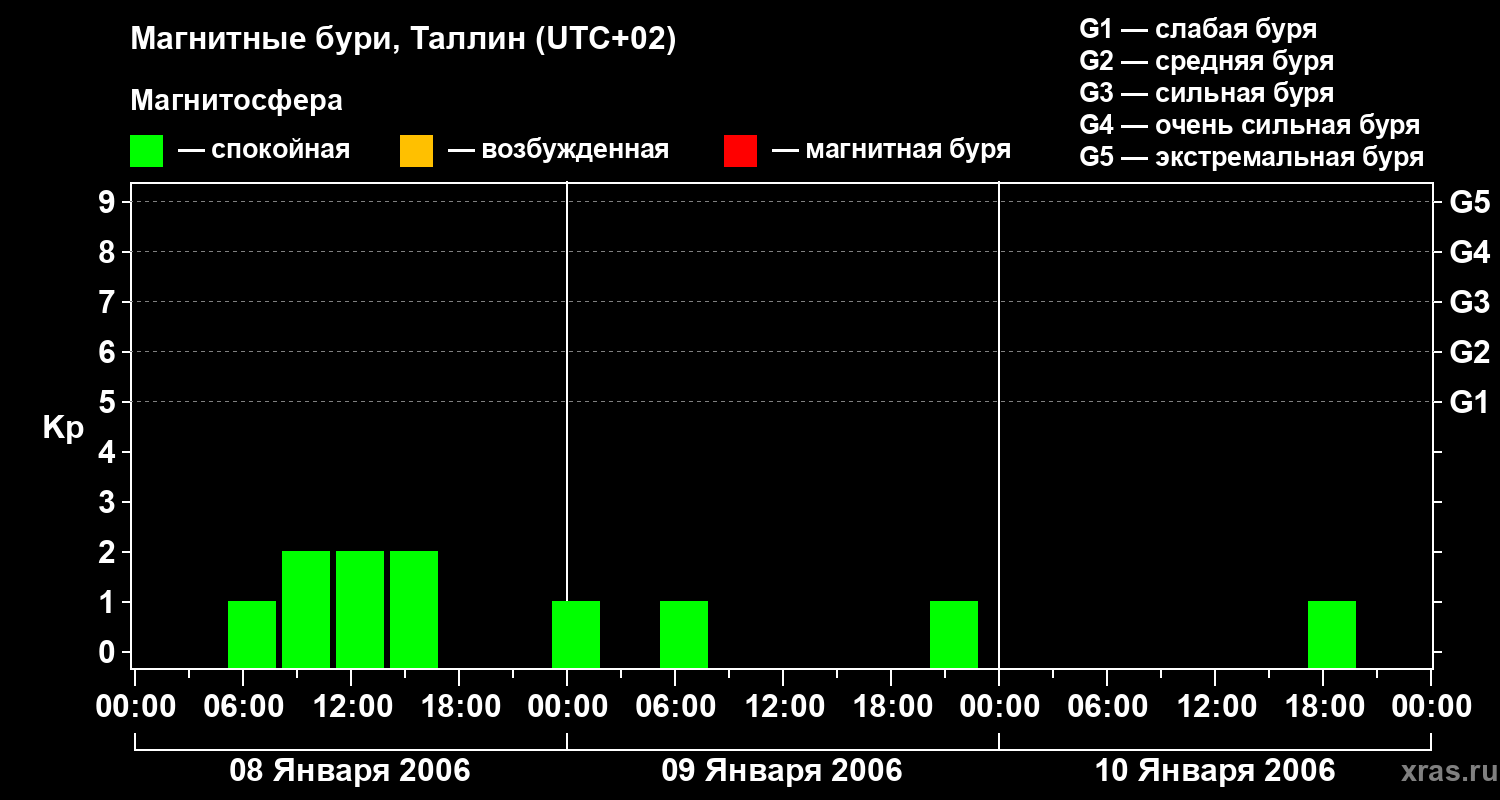 Изменения геомагнитного индекса Kp с 8 по 10 января 2006 года для средних широт