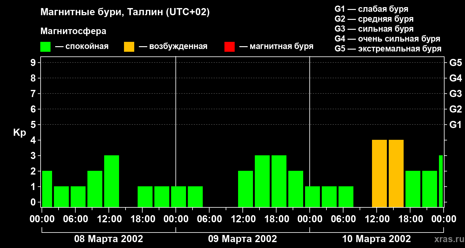 Изменения геомагнитного индекса Kp с 8 по 10 марта 2002 года для средних широт