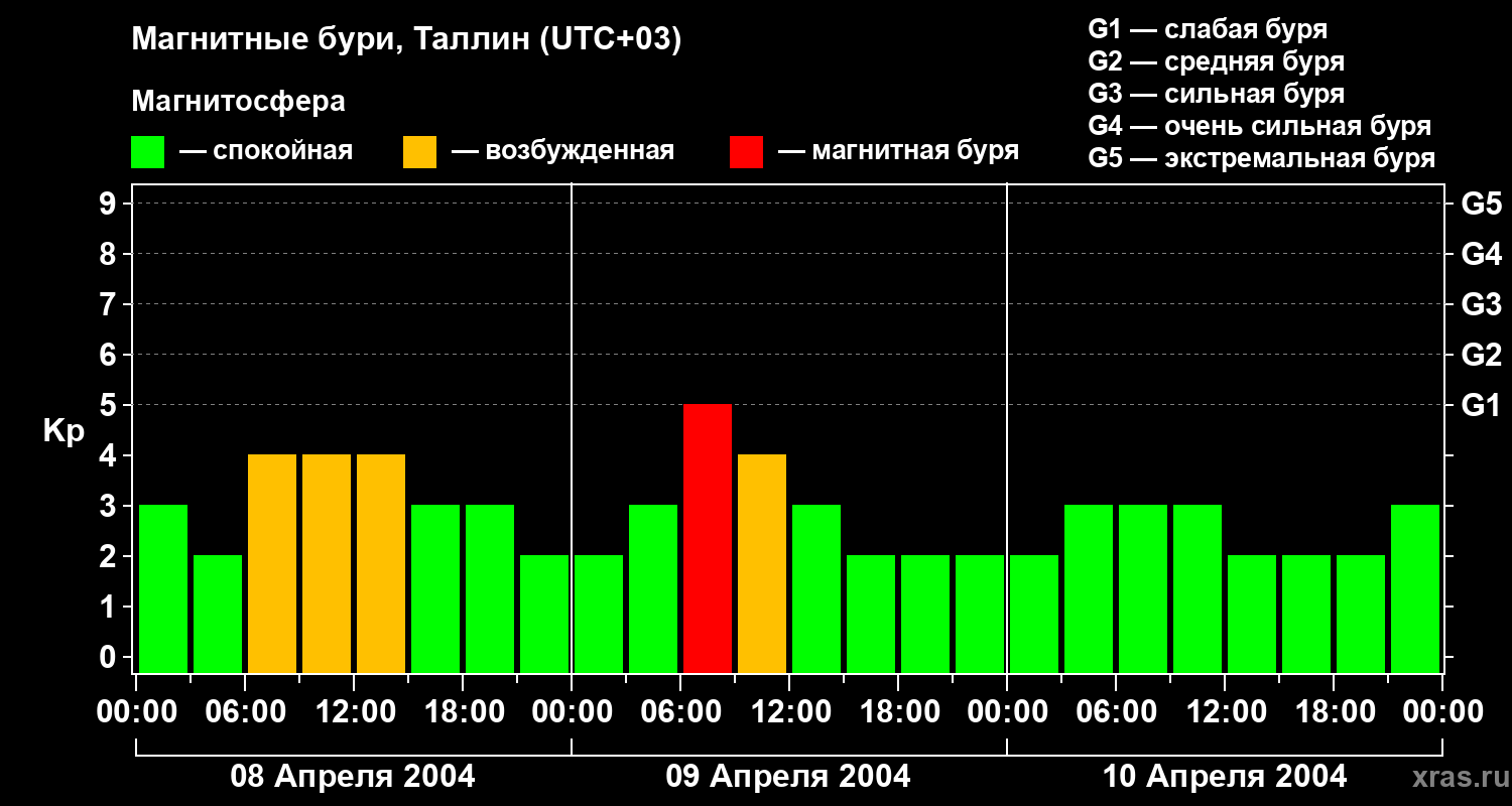 Изменения геомагнитного индекса Kp с 8 по 10 апреля 2004 года для средних широт