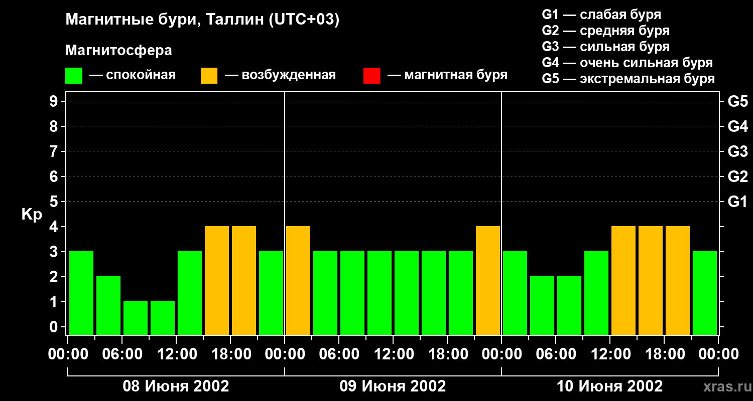Изменения геомагнитного индекса Kp с 8 по 10 июня 2002 года для средних широт