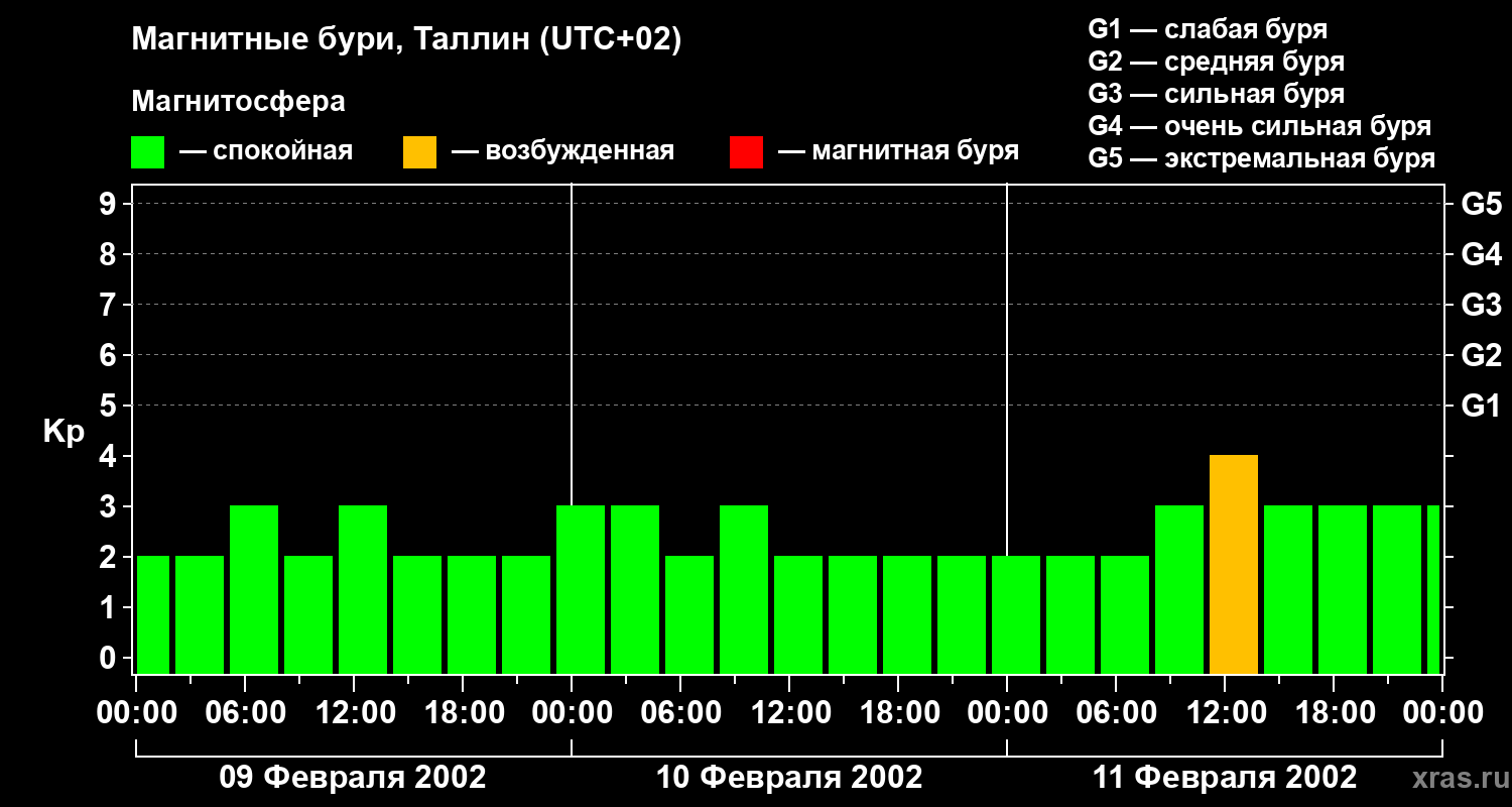 Изменения геомагнитного индекса Kp с 9 по 11 февраля 2002 года для средних широт