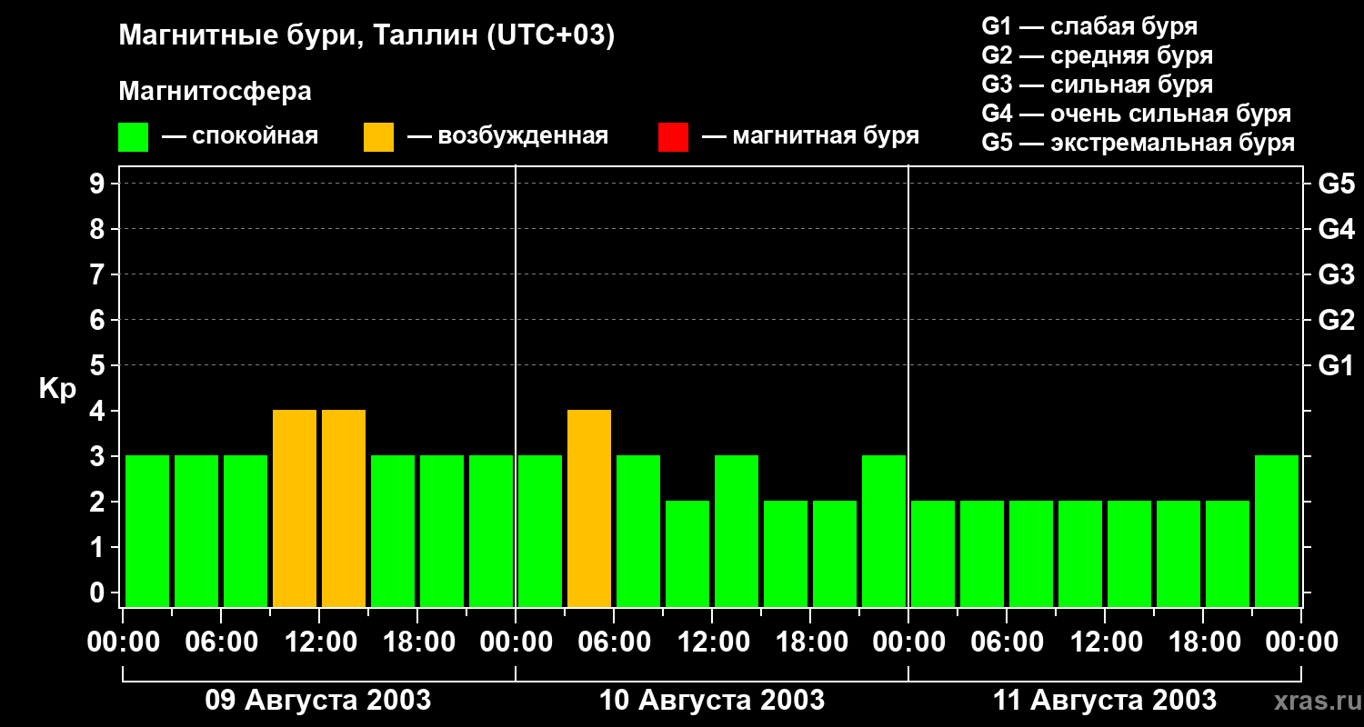 Изменения геомагнитного индекса Kp с 9 по 11 августа 2003 года для средних широт