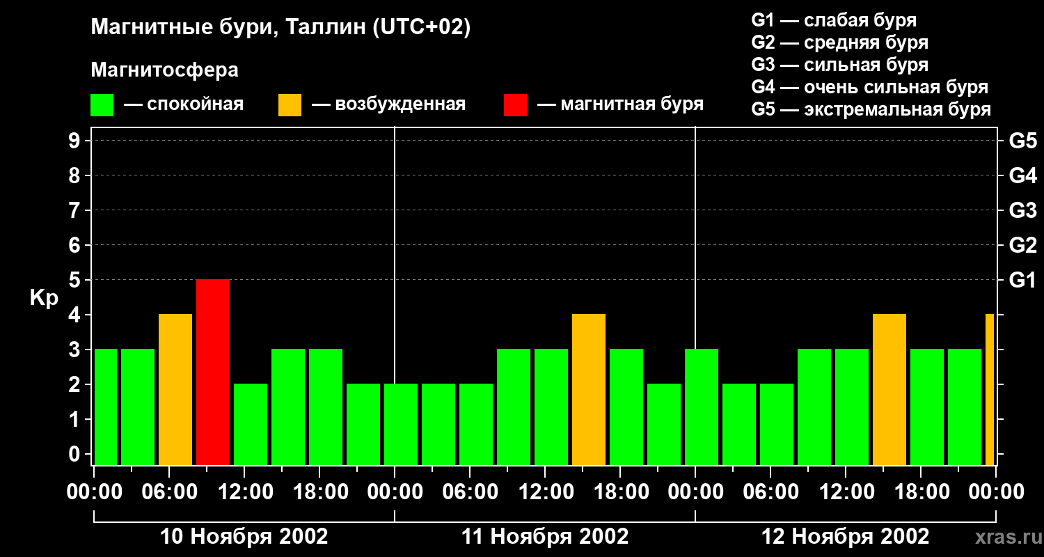 Изменения геомагнитного индекса Kp с 10 по 12 ноября 2002 года для средних широт