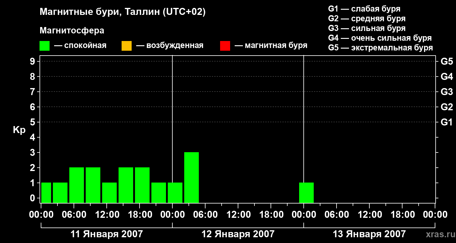 Изменения геомагнитного индекса Kp с 11 по 13 января 2007 года для средних широт