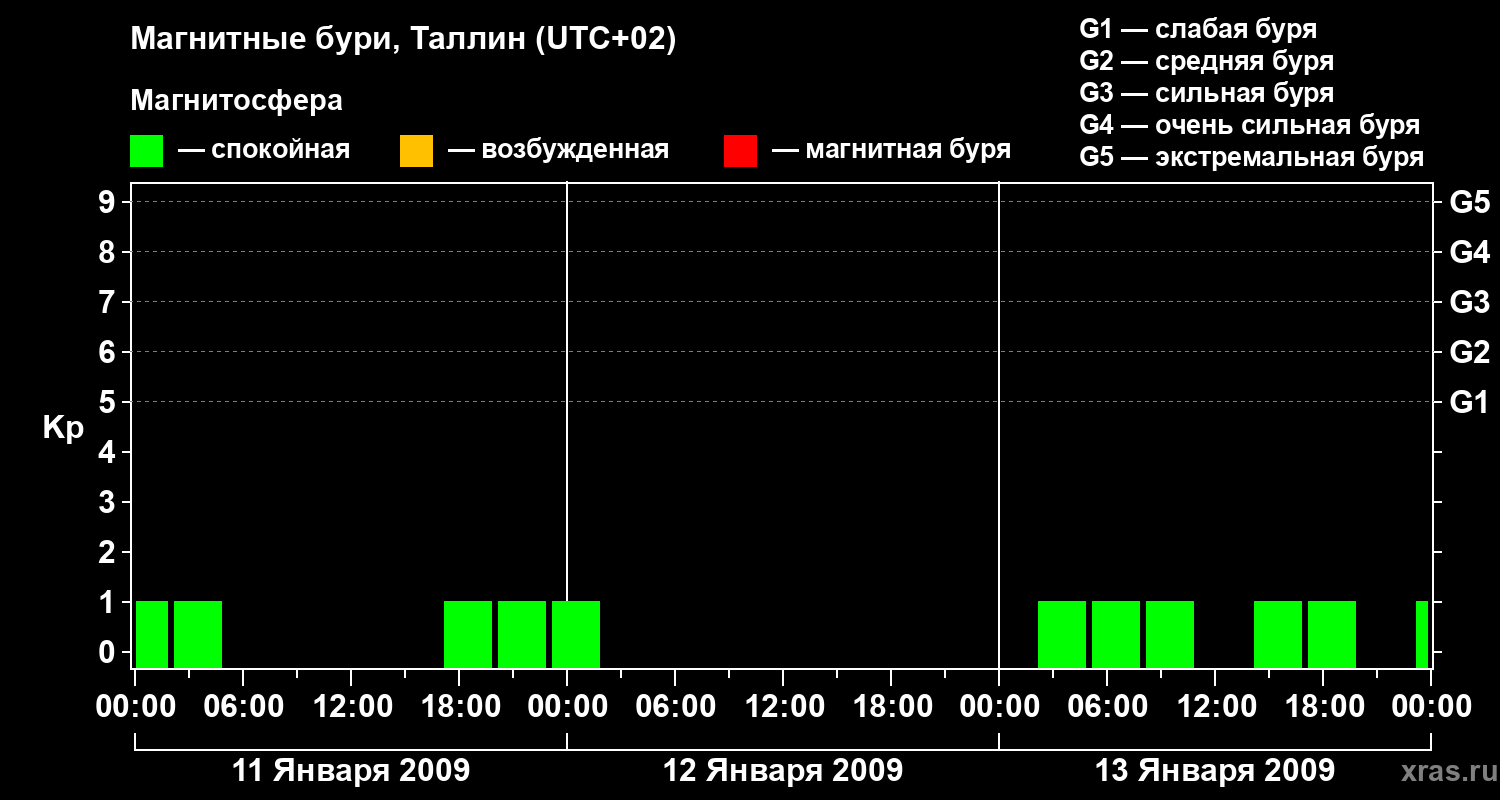 Изменения геомагнитного индекса Kp с 11 по 13 января 2009 года для средних широт