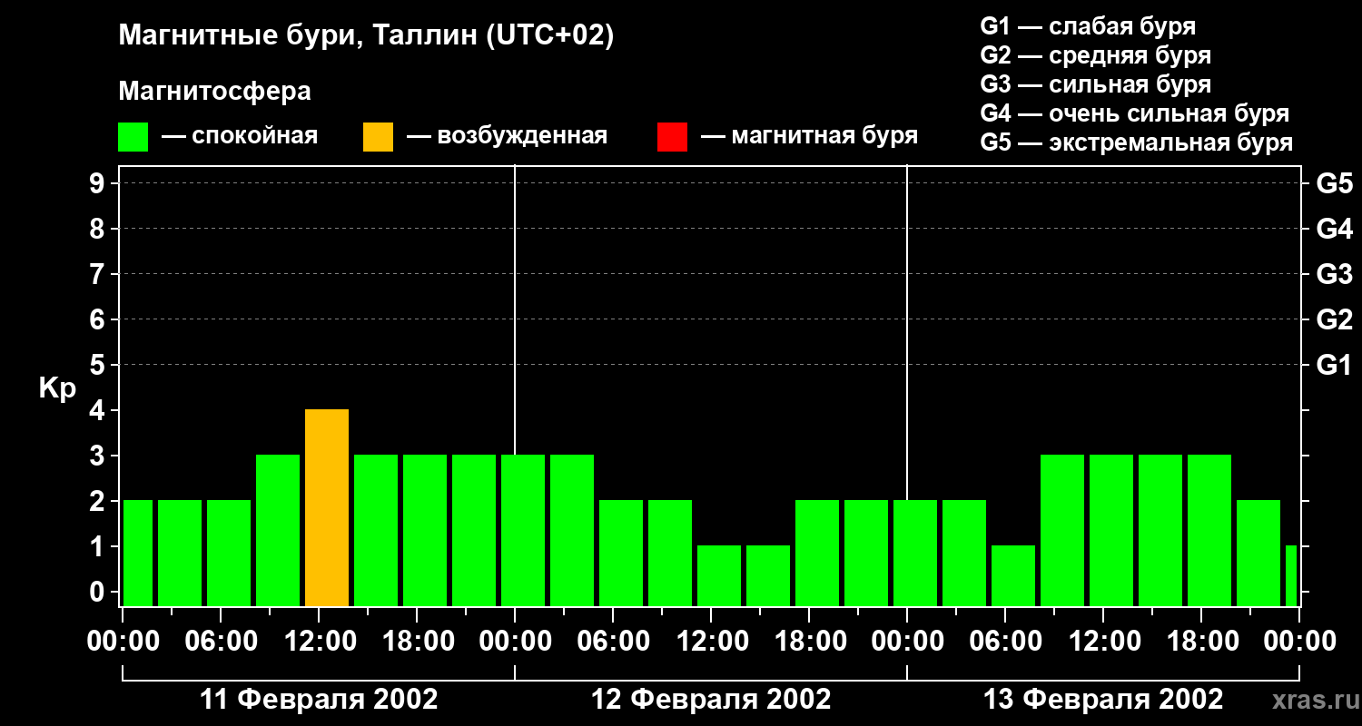 Изменения геомагнитного индекса Kp с 11 по 13 февраля 2002 года для средних широт