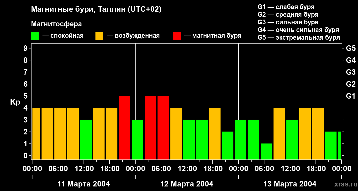 Изменения геомагнитного индекса Kp с 11 по 13 марта 2004 года для средних широт