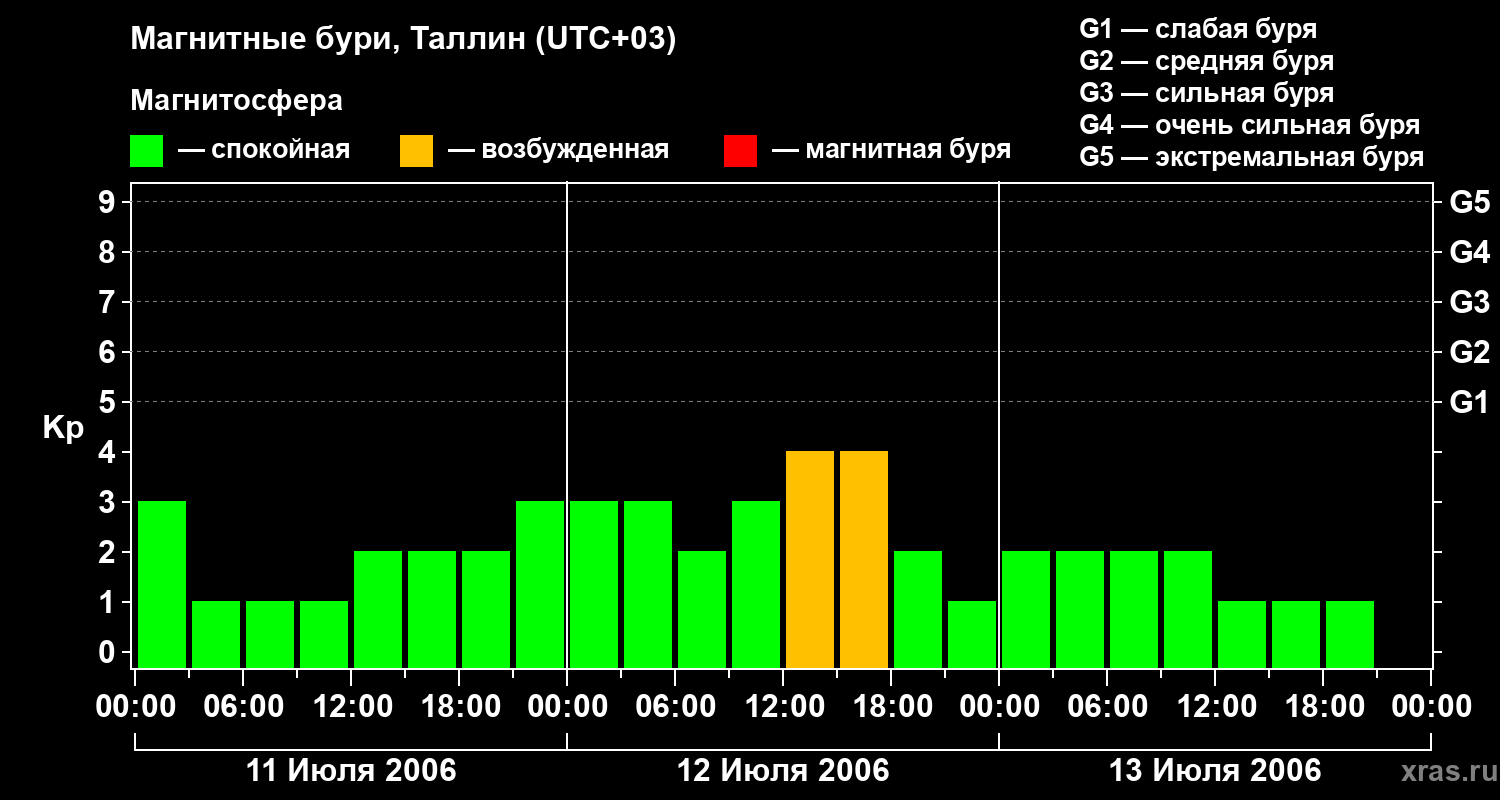 Изменения геомагнитного индекса Kp с 11 по 13 июля 2006 года для средних широт