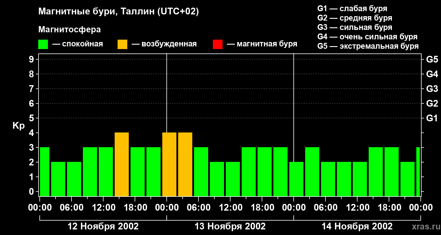 Изменения геомагнитного индекса Kp с 12 по 14 ноября 2002 года для средних широт