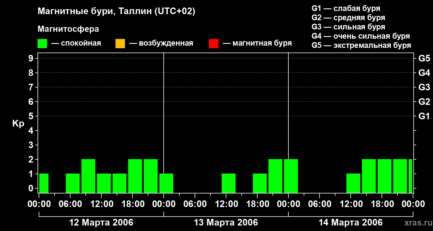 Изменения геомагнитного индекса Kp с 12 по 14 марта 2006 года для средних широт