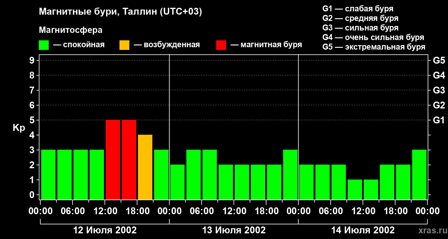 Изменения геомагнитного индекса Kp с 12 по 14 июля 2002 года для средних широт