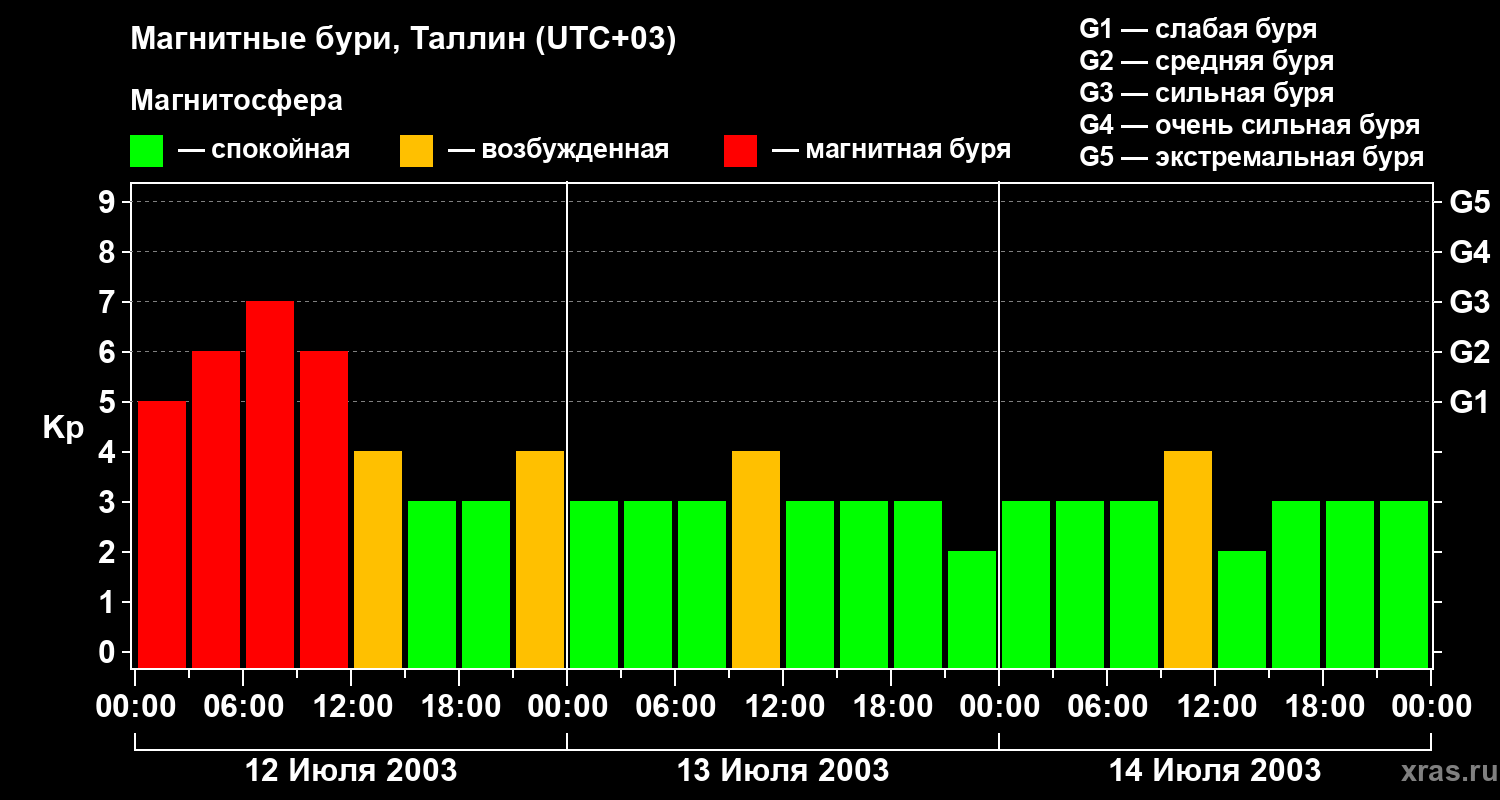 Изменения геомагнитного индекса Kp с 12 по 14 июля 2003 года для средних широт