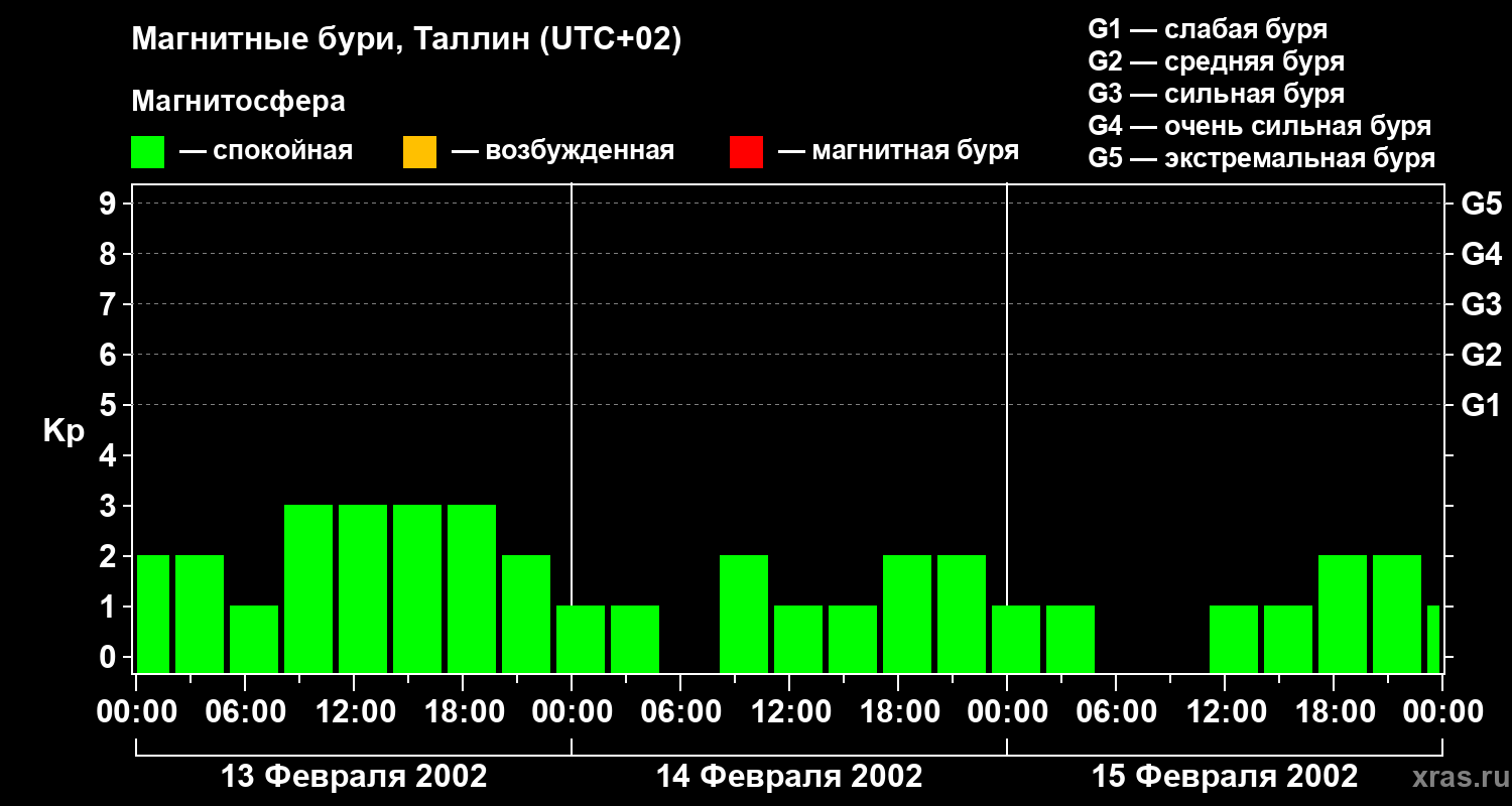 Изменения геомагнитного индекса Kp с 13 по 15 февраля 2002 года для средних широт