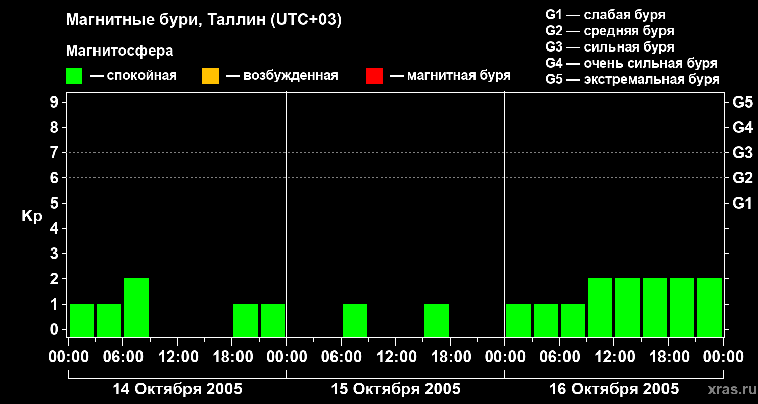 Изменения геомагнитного индекса Kp с 14 по 16 октября 2005 года для средних широт