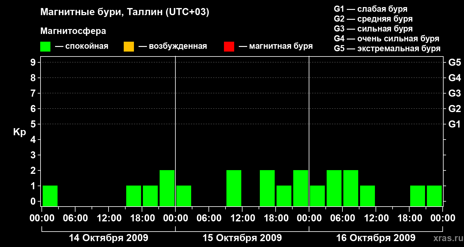 Изменения геомагнитного индекса Kp с 14 по 16 октября 2009 года для средних широт
