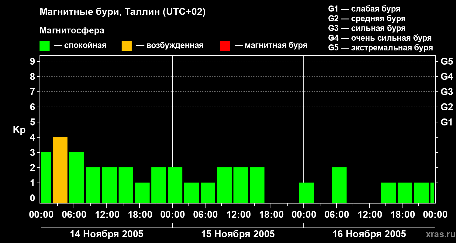 Изменения геомагнитного индекса Kp с 14 по 16 ноября 2005 года для средних широт