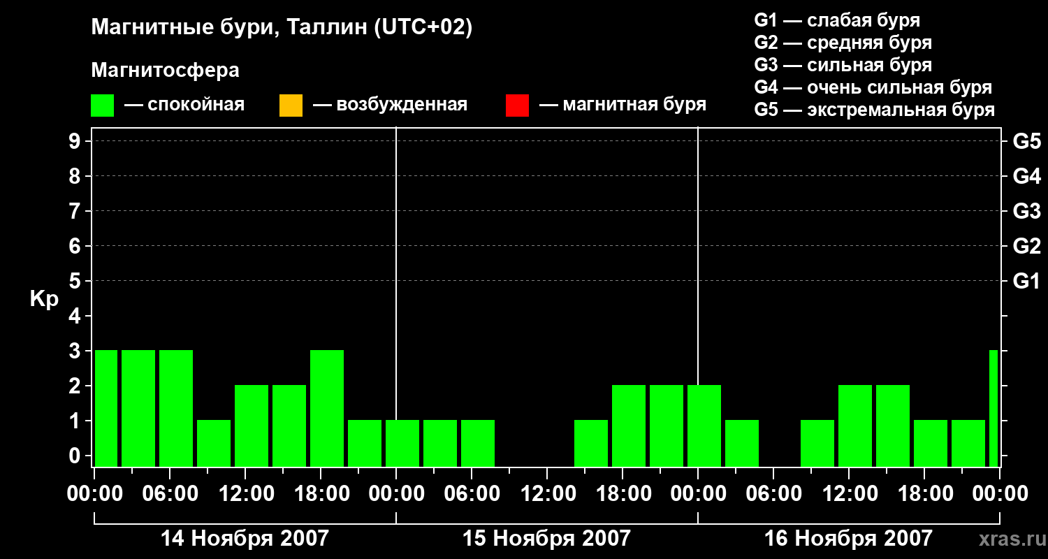 Изменения геомагнитного индекса Kp с 14 по 16 ноября 2007 года для средних широт