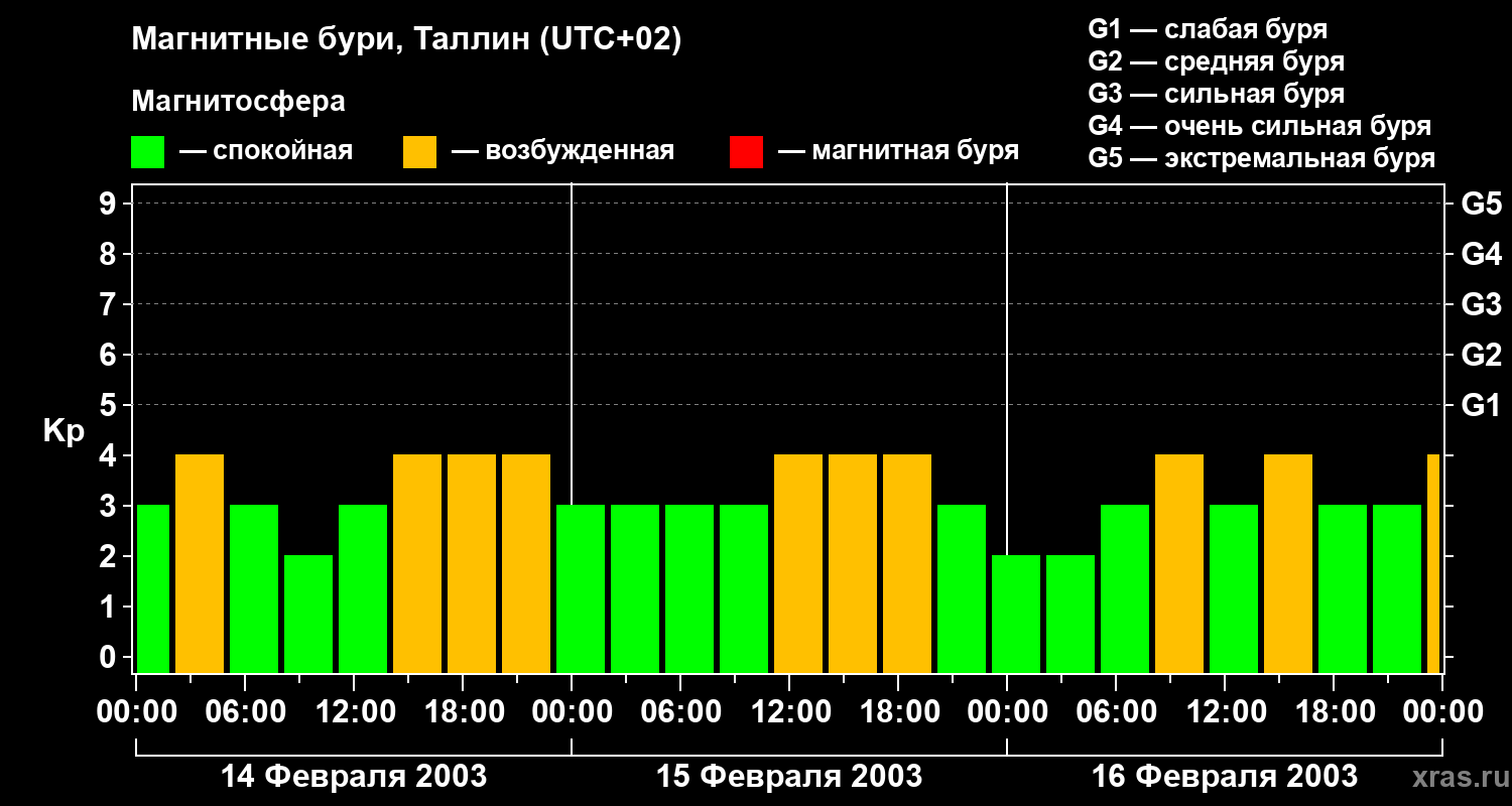 Изменения геомагнитного индекса Kp с 14 по 16 февраля 2003 года для средних широт