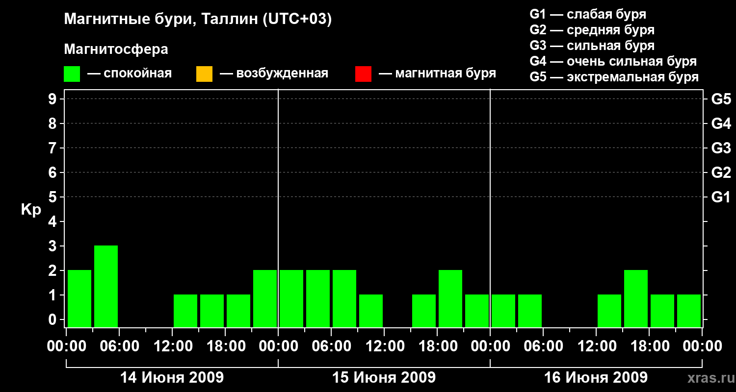 Изменения геомагнитного индекса Kp с 14 по 16 июня 2009 года для средних широт