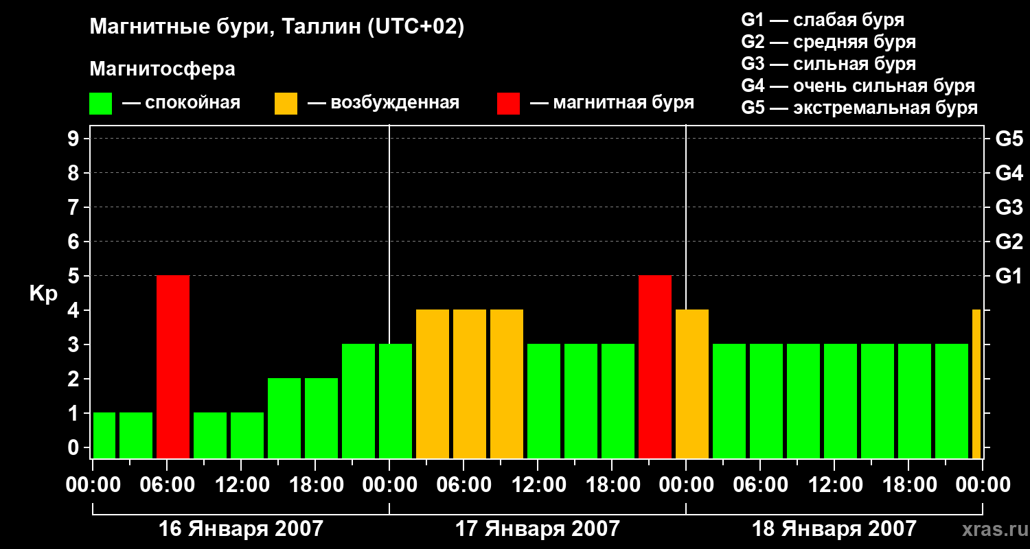 Изменения геомагнитного индекса Kp с 16 по 18 января 2007 года для средних широт