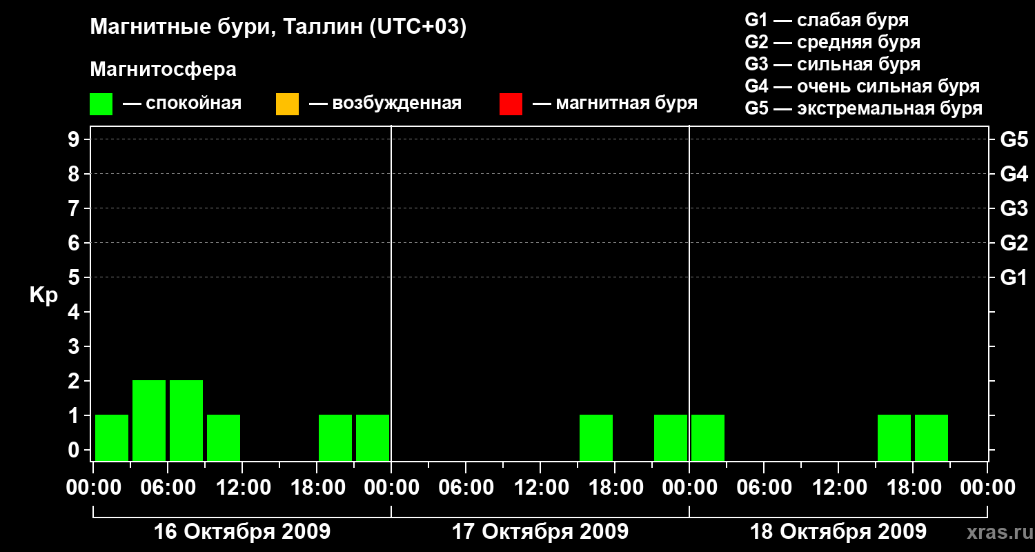 Изменения геомагнитного индекса Kp с 16 по 18 октября 2009 года для средних широт