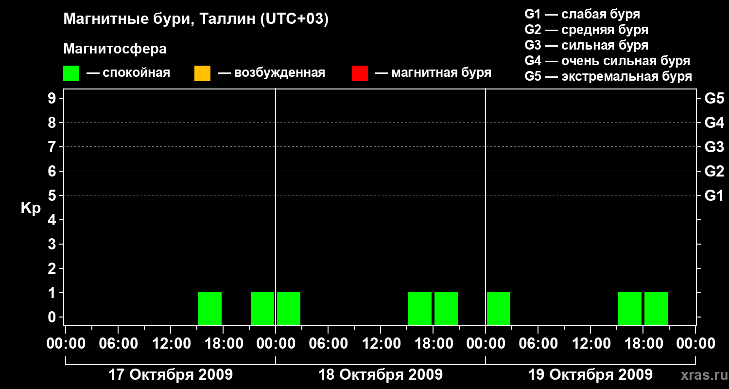 Изменения геомагнитного индекса Kp с 17 по 19 октября 2009 года для средних широт