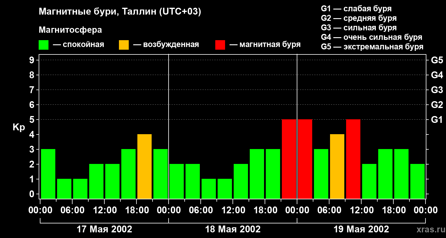 Изменения геомагнитного индекса Kp с 17 по 19 мая 2002 года для средних широт