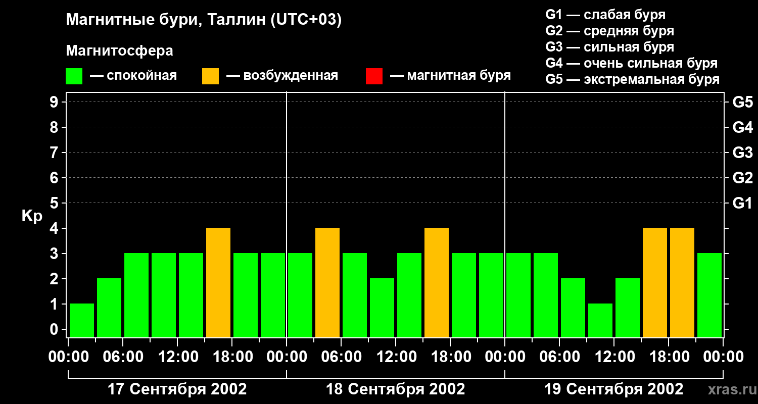 Изменения геомагнитного индекса Kp с 17 по 19 сентября 2002 года для средних широт