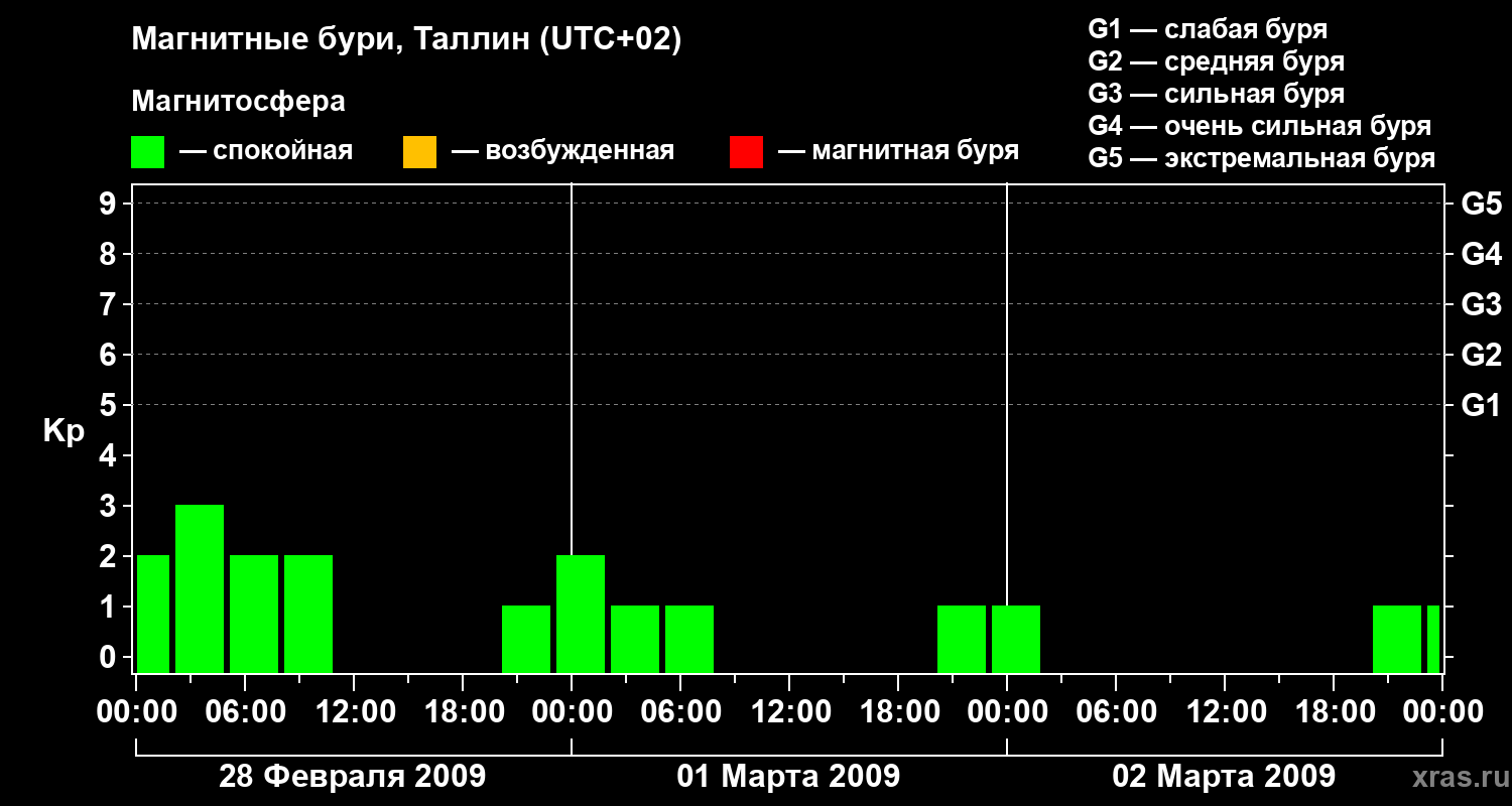 Изменения геомагнитного индекса Kp с 28 февраля по 2 марта 2009 года для средних широт