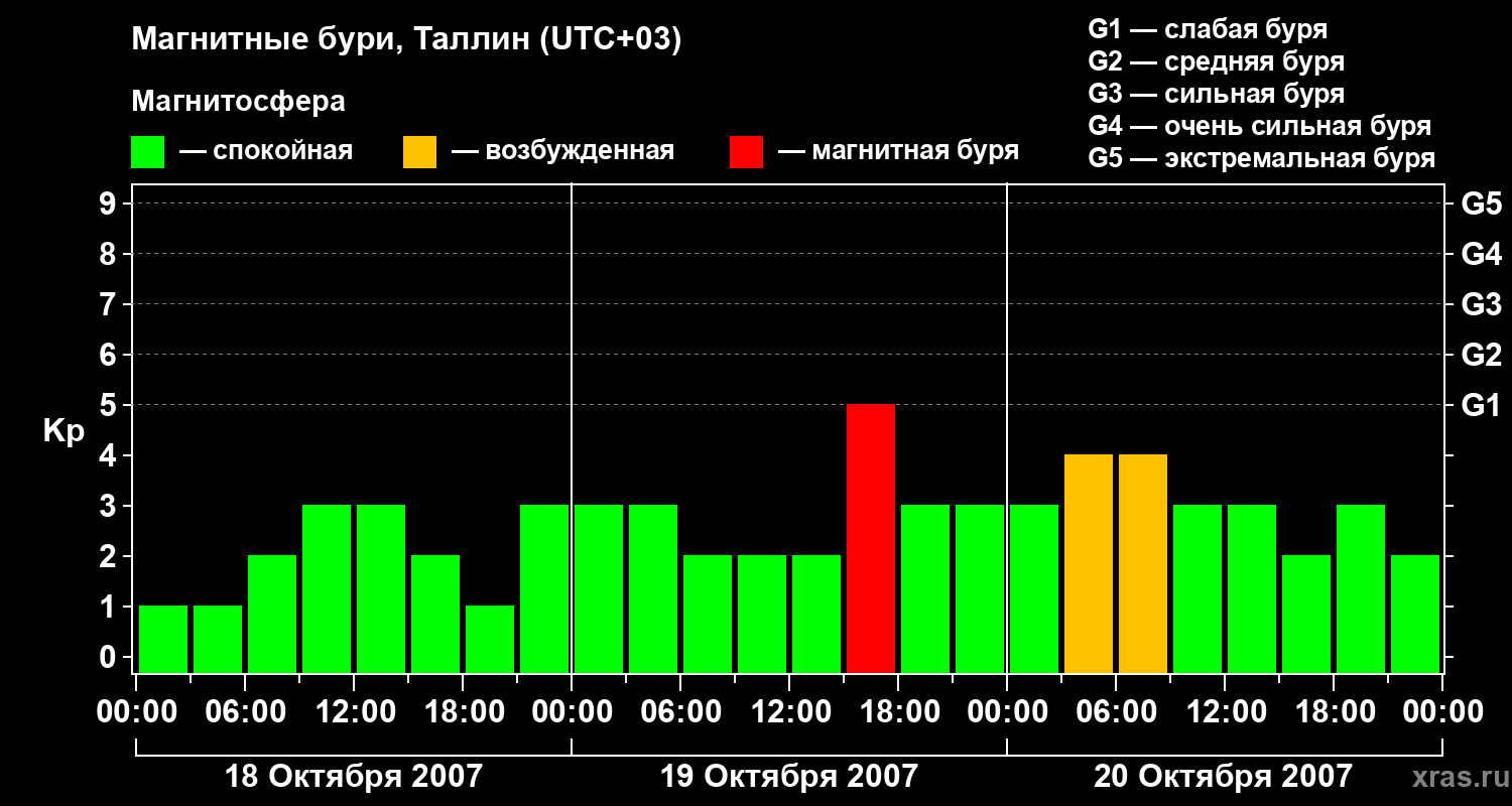 Изменения геомагнитного индекса Kp с 18 по 20 октября 2007 года для средних широт