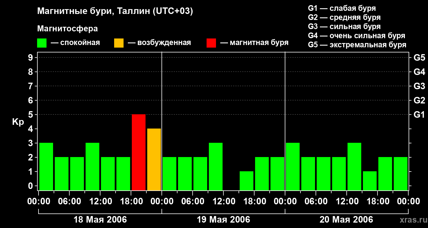 Изменения геомагнитного индекса Kp с 18 по 20 мая 2006 года для средних широт