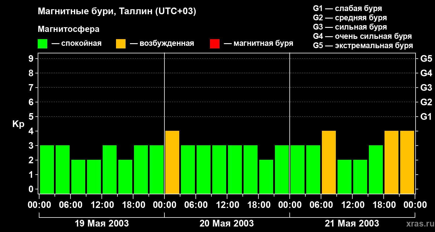 Изменения геомагнитного индекса Kp с 19 по 21 мая 2003 года для средних широт