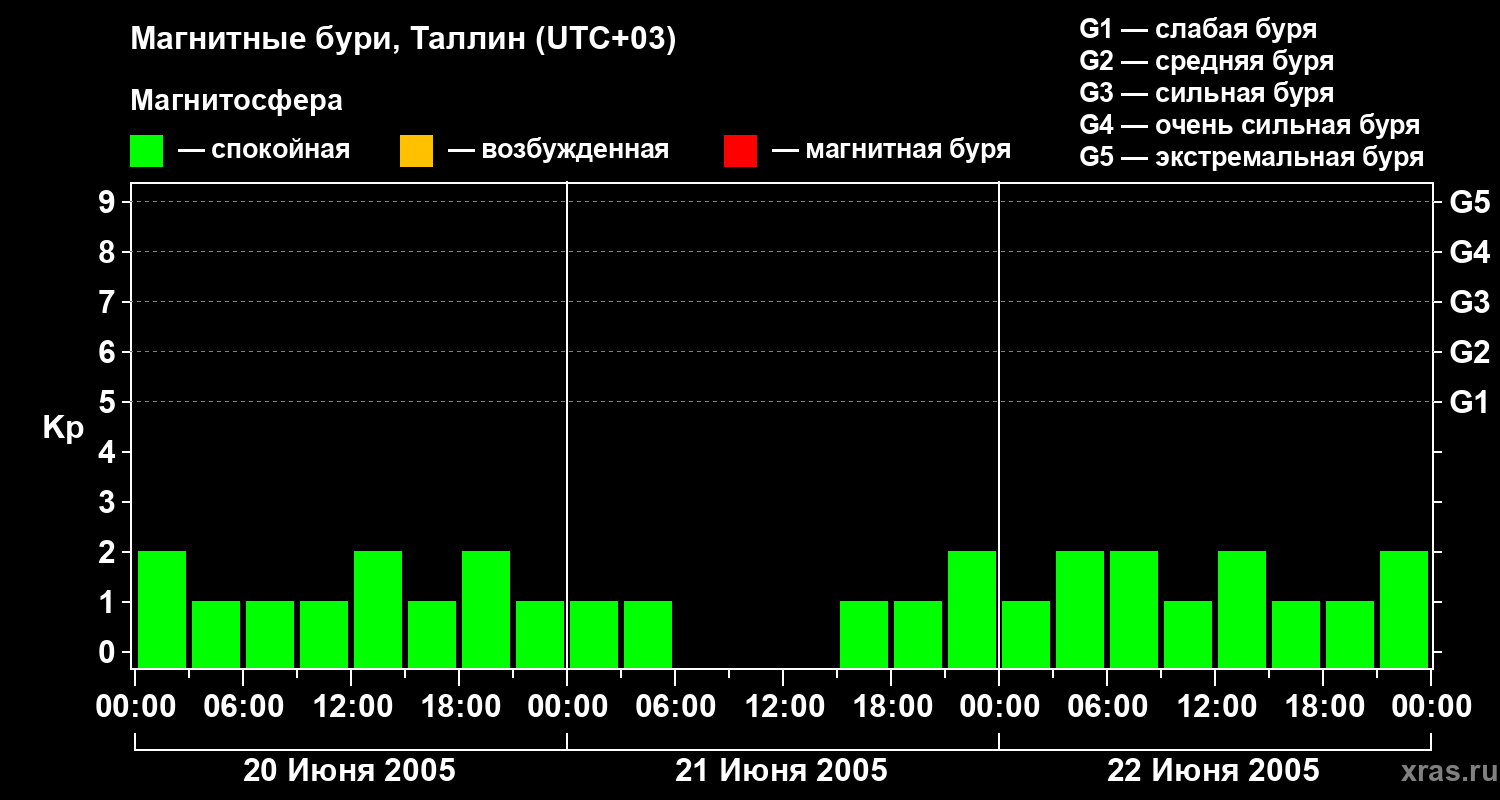 Изменения геомагнитного индекса Kp с 20 по 22 июня 2005 года для средних широт