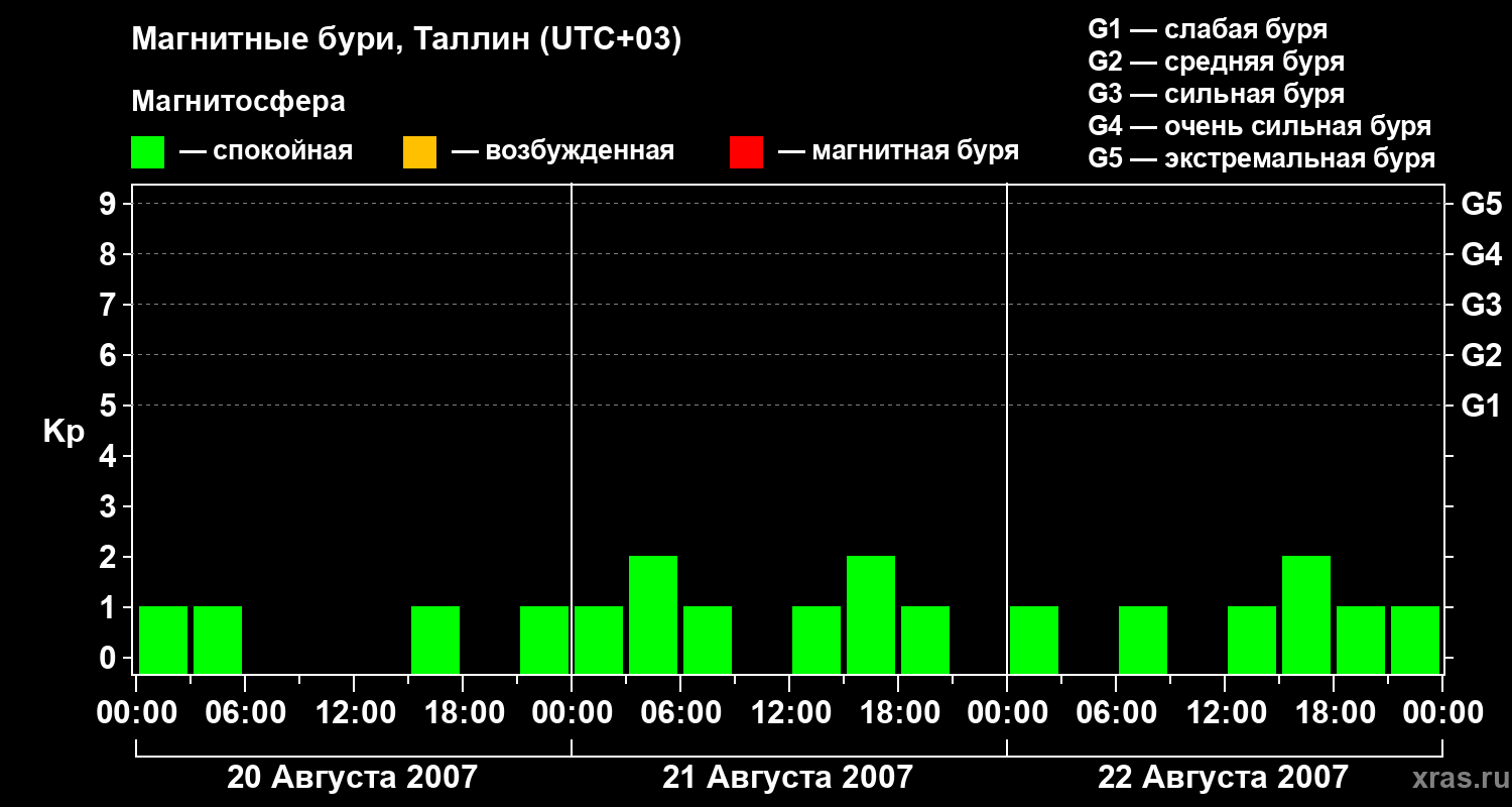 Изменения геомагнитного индекса Kp с 20 по 22 августа 2007 года для средних широт