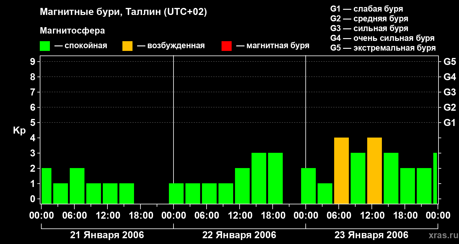 Изменения геомагнитного индекса Kp с 21 по 23 января 2006 года для средних широт