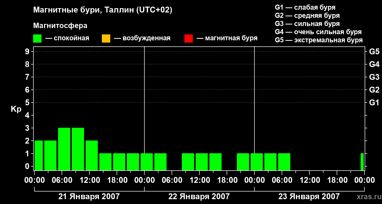 Изменения геомагнитного индекса Kp с 21 по 23 января 2007 года для средних широт